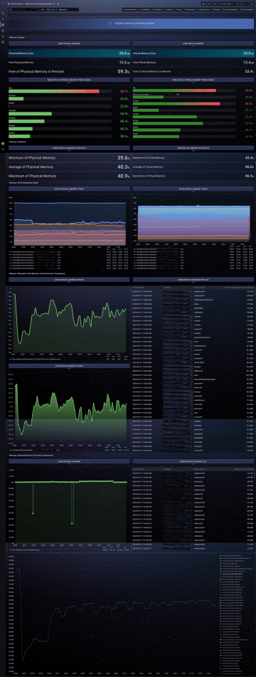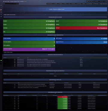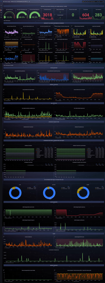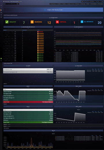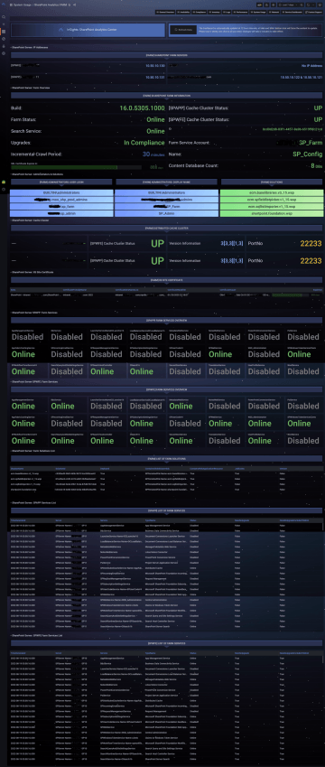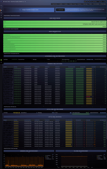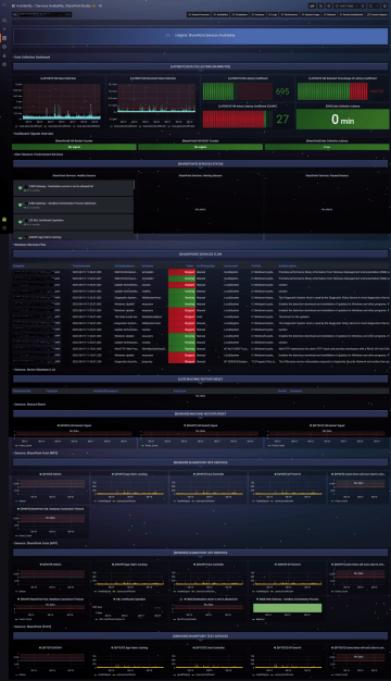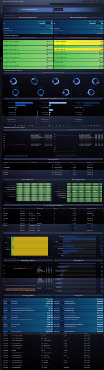 Specializované dashboardy na SharePoint servery (2016 a novější), K2 Five servery a SQL servery ukazují detailní údaje využití a nastavení, specifické pro tyto samotné systémy.